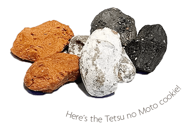 鉄の原材料である鉄鉱石(ココア)、石灰石(きな粉)、石炭(黒ごま)をモチーフに。