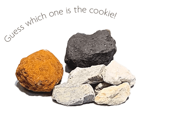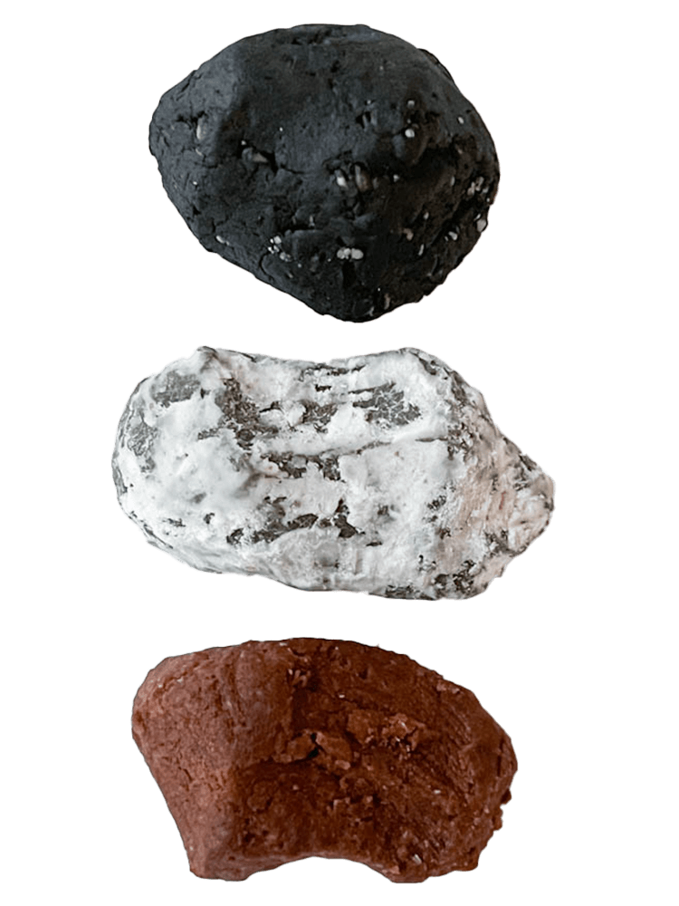 鉄をつくるのに欠かせない三つの素材『鉄鉱石』『石灰石』『石炭』それらをモチーフにして、ココア、きな粉、黒ごまで表現してみたら…。